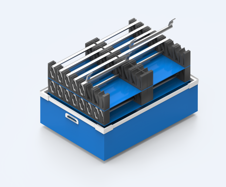 Una de las soluciones más eficaces es el embalaje retornable a medida. En este tipo de sistemas se sustituyen los embalajes desechables por soluciones reutilizables diseñadas específicamente para cada pieza. Un ejemplo de este enfoque es el uso de bandejas posicionadoras apilables con peines de polietileno de baja abrasividad, integradas en cajas de polipropileno a medida, apilables, con asas, serigrafía y portaetiquetas para la correcta identificación del producto.